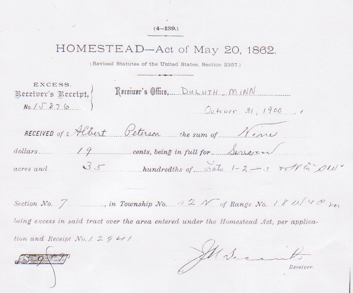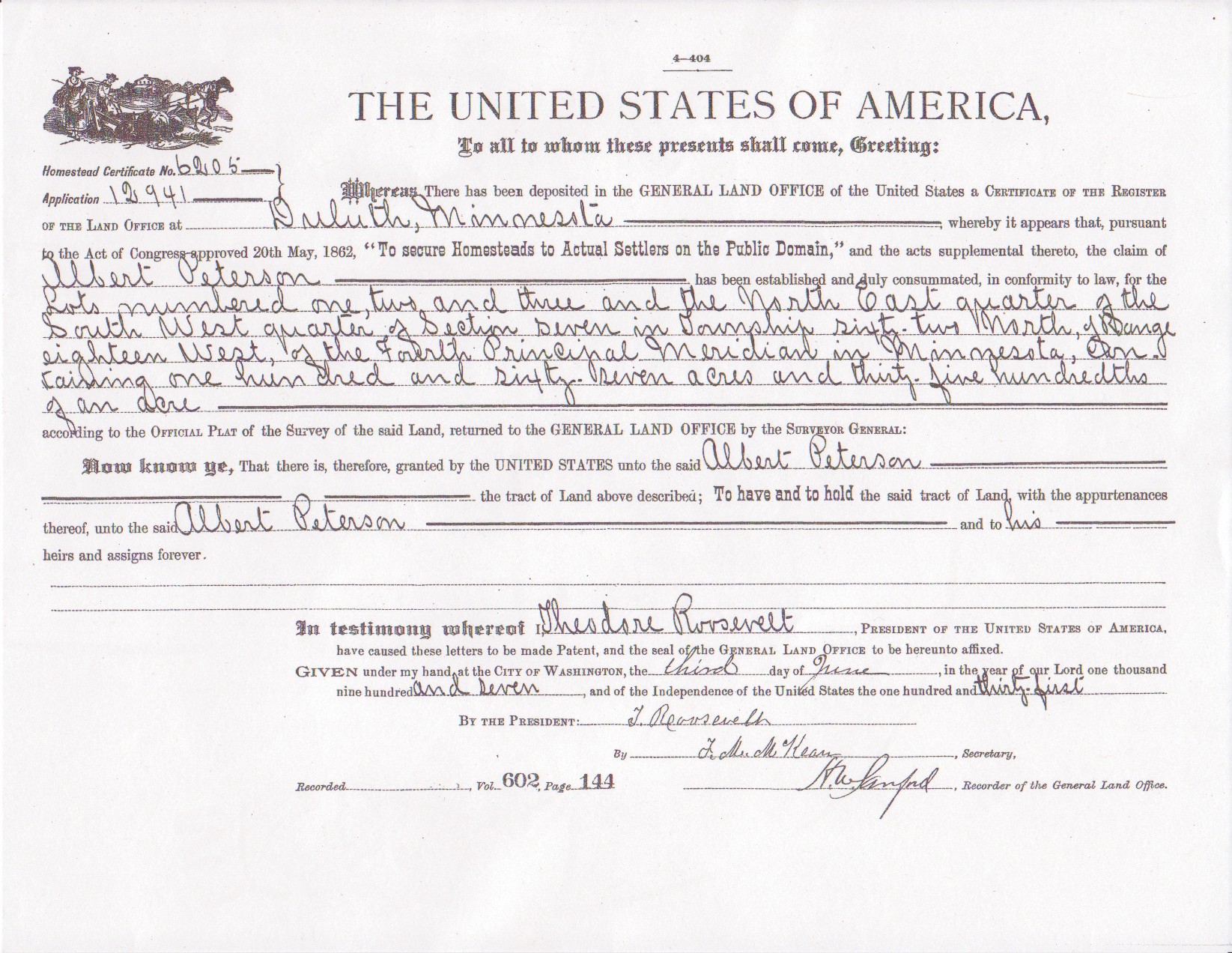 I don’t know if this was really signed by Teddy Roosevelt or by one of his minions, but I like to think he held this piece of paper and signed his name to it. After 7 years of hard labor, (and $9.19) it was theirs. By then he and Great Grandma Augusta had been married 5 years.