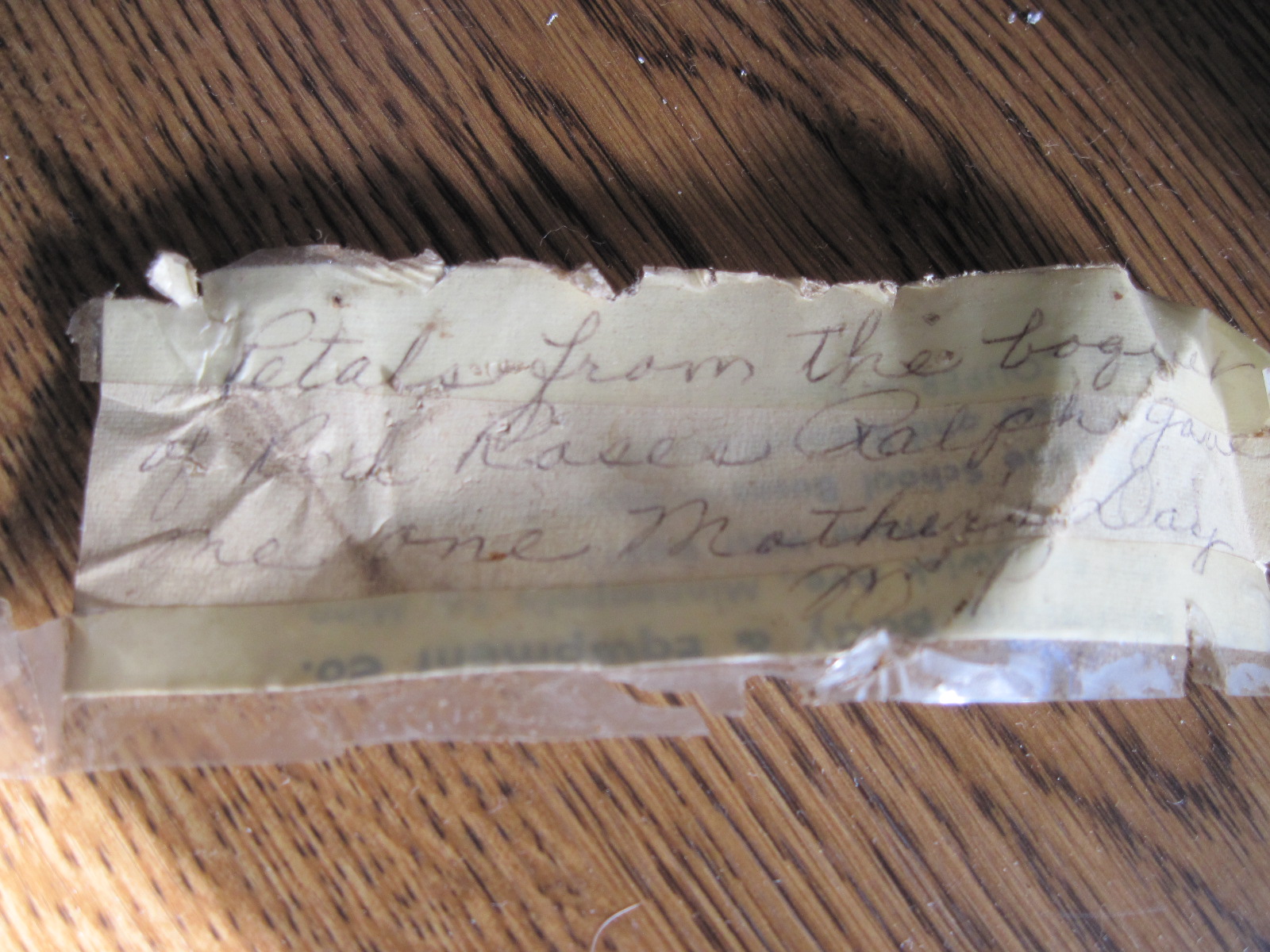 The note reads: “Petals from the boquet of Red Roses Ralph gave me one Mother’s Day. M.P.”