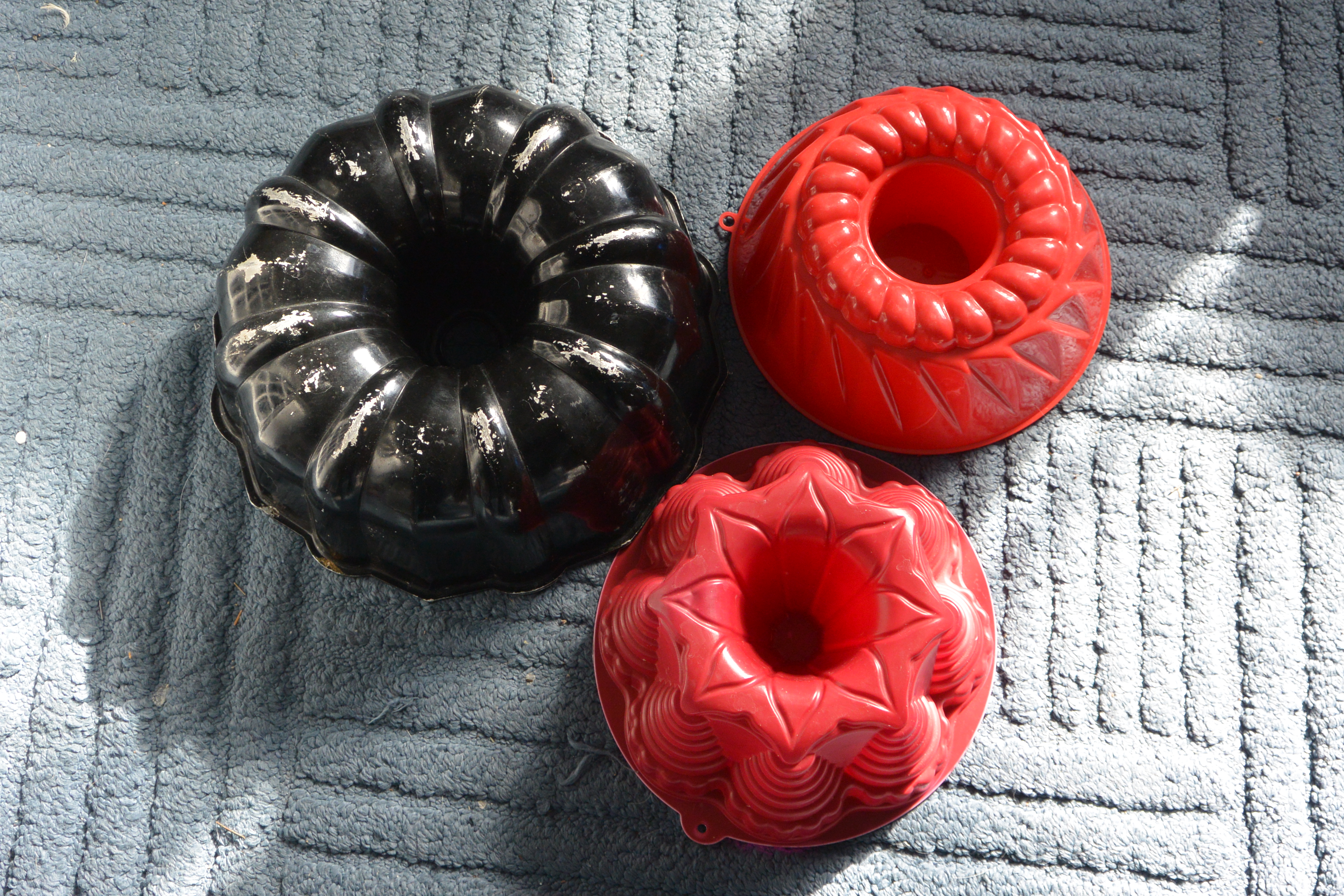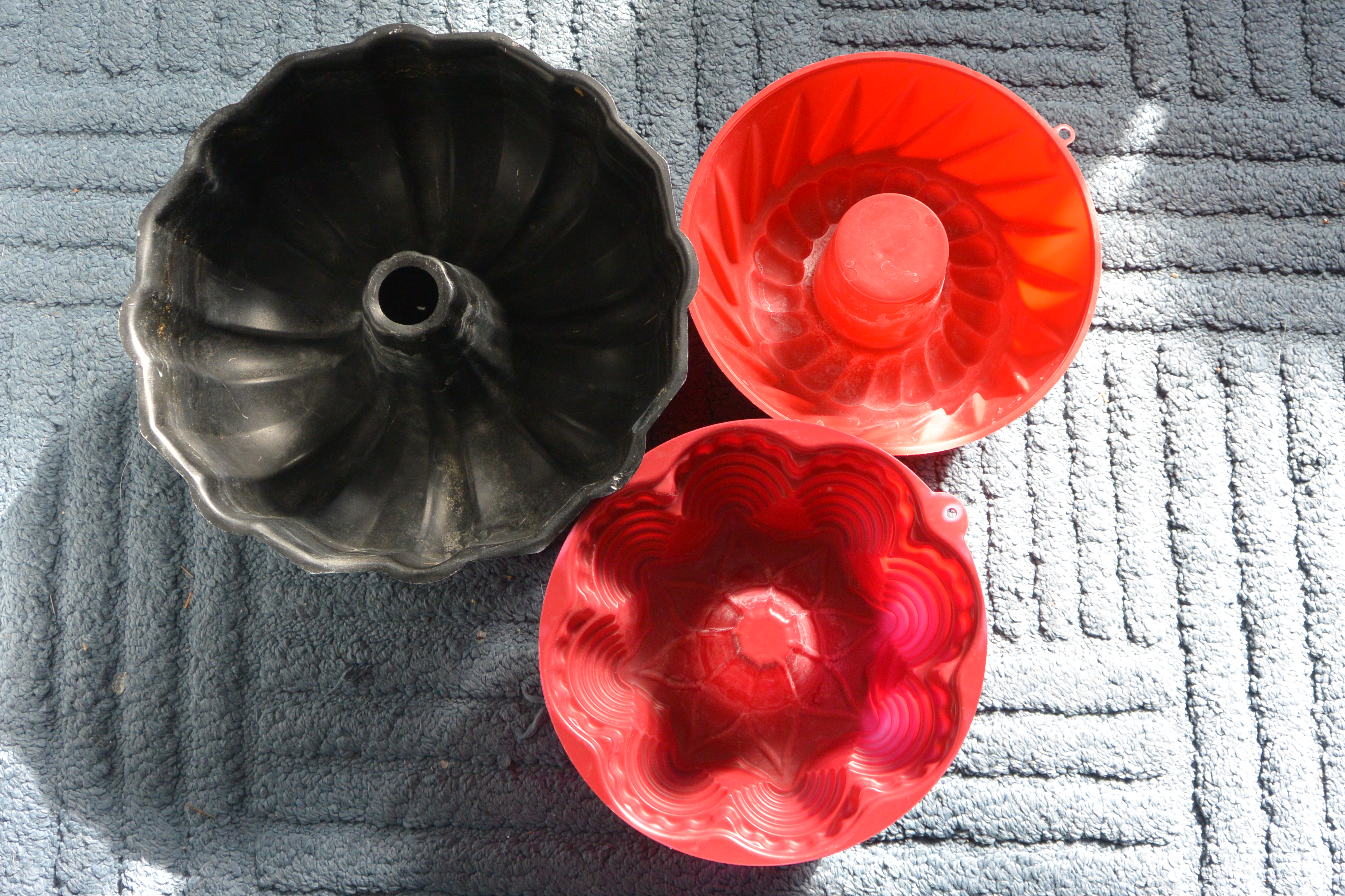 First, I took all the molds outside and then filled them using pitchers of water. (This idea came to me last summer, so every time I saw a Bundt-shaped mold at the Thrift Shop, I snagged it. I’m happy to report that even the plastic ones worked great, and have yet to crack.)