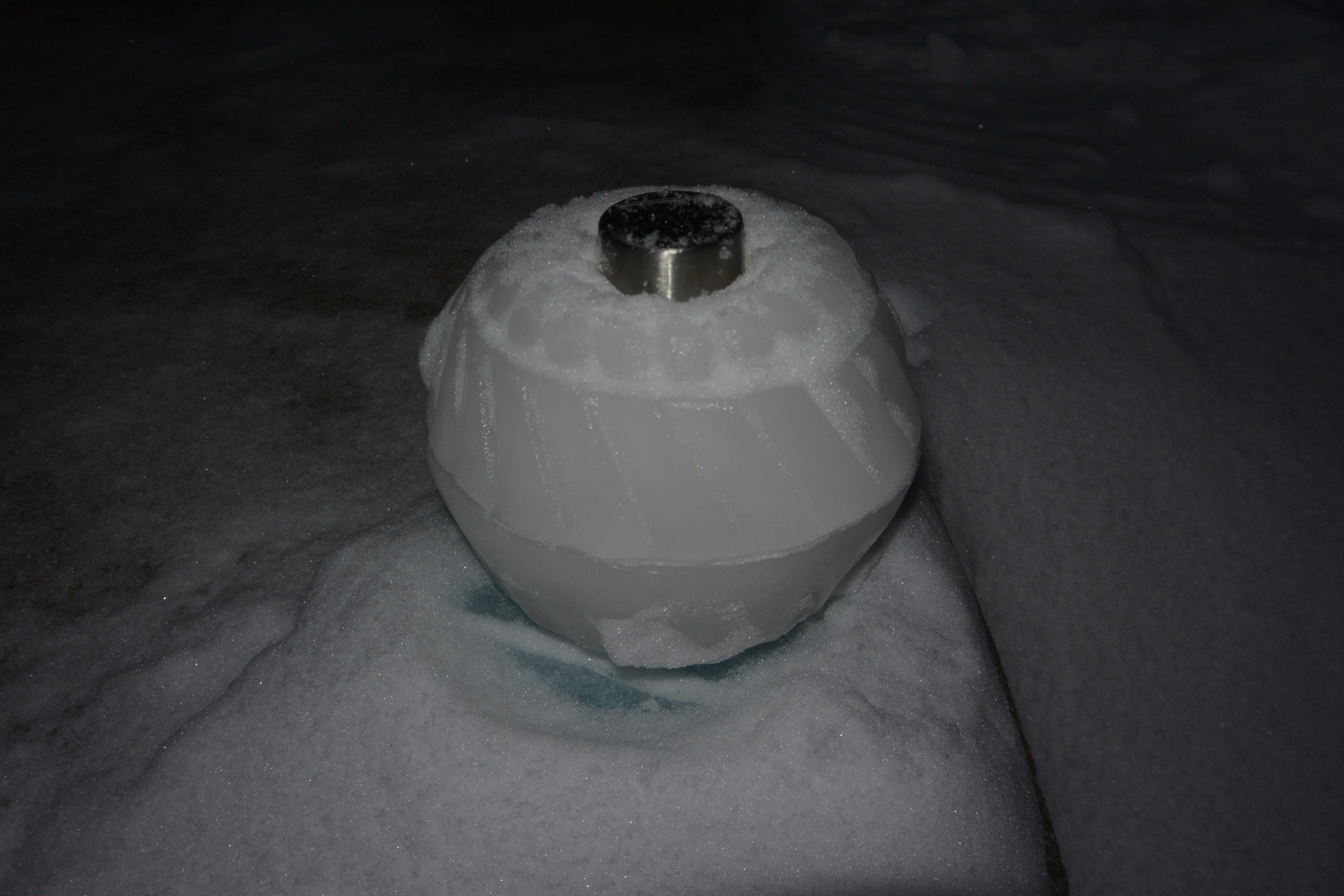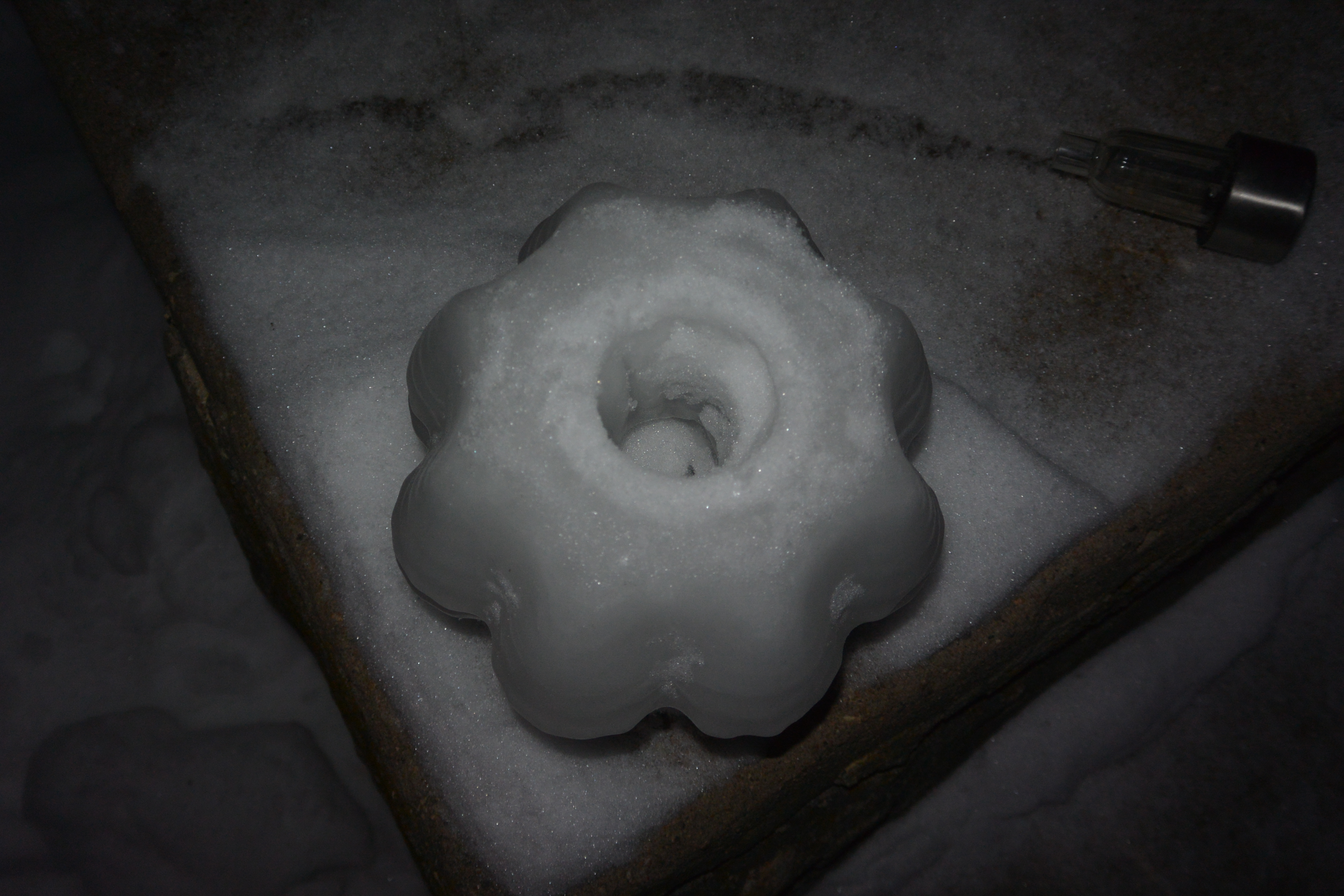 To release them from the mold, I ran a little hot water in the kitchen sink. They pop out after a few seconds. Sometimes, if the water freezes too fast, there will be a bulge in the ice. You can chip it off carefully, use a warm cookie sheet to melt it flat, or if you’re not a perfectionist, just build up the other side with snow later when you put the two halves together.